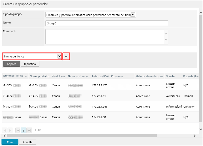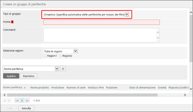 [Dinamico (Specifica automatica delle periferiche per mezzo dei filtri)] | Consente di aggiungere automaticamente al gruppo le periferiche che corrispondono alle condizioni specificate con il filtro. Vengono aggiunte al gruppo anche le nuove periferiche rilevate dopo la creazione del gruppo, se soddisfano le condizioni. |