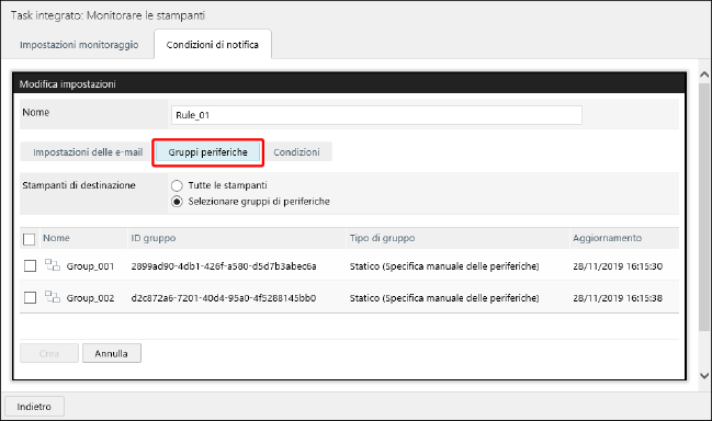 [Condizione di notifica] | Visualizza le notifiche impostate. Per eliminare una condizione di notifica, fare clic su [ ] a destra della condizione. |