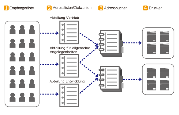 Die in der Empfängerliste verwalteten Empfänger können in Adresslisten und Zielwahlen registriert werden. |