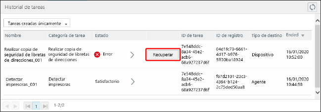 Si aparece [Error] o [Tiempo de espera agotado] en el [Estado] de una tarea creada por un usuario, se puede crear una tarea de recuperación para volver a ejecutar la tarea.