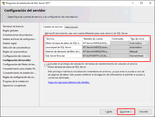 Confirme que se muestra la pestaña [Cuentas de servicio] en la pantalla [Configuración del servidor], como se indica a continuación, y haga clic en [Siguiente].