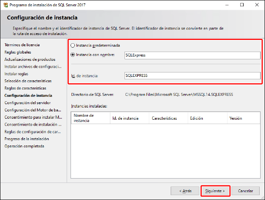 Al instalar este software, introduzca el nombre de instancia que haya configurado aquí. |