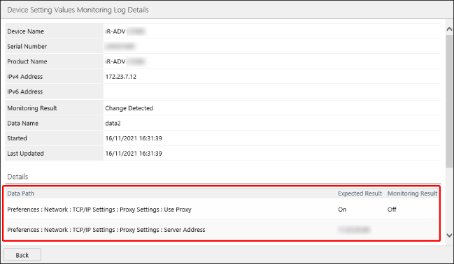 在 [Device Setting Values Monitoring Log Details] 页面上,可以检查各项与标准设备设置值进行比较的结果。