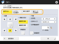 印字は表紙(表紙や裏表紙を付ける)や挿入紙(合紙や章紙を差し込む(挿入紙))には印刷されません。 部数印字はコピーしたすべてのページに印字されます。 部数印字と一緒に日付や文字列を印字することもできます。<部数印字拡張の設定> <ページ印字>と<スタンプ>の文字列は<ページ印字/スタンプの文字列登録>に登録されている文字列から選ぶこともできます。 <ページ印字>、<スタンプ>、<日付印字>、<部数印字>のいずれかで、同じ印字位置を指定しているときは、 (スタート)を押すと、そのままの設定でプリントするかを確認する画面が表示されます。章付き数字と<挿入紙>を組み合わせて設定したとき、章番号のカウントアップは次のようになります。 章紙を設定したページでカウントアップされます。 合紙が挿入されたあと、カウントアップされます。 <部数印字拡張>を<ON>に設定しているときは、以下のように設定できる内容が変わります。<部数印字拡張の設定> 部数印字の印字位置で<全面に印字>、<5箇所に印字>を選択することができなくなります。 部数印字の印字サイズが、<10.5ポイント>、<12.0ポイント>、<14.0ポイント>となります。 |