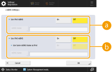 2 | Carry out the necessary settings. ![]() <IPv4>Press <Host Name>, and enter the host name of the machine to register on the DNS server using alphanumeric characters. Press <Domain Name>, and enter the domain name which the machine belongs to using alphanumeric characters (Example: "example.com"). <IPv6>To set the host name and domain name to be the same as IPv4, press <On> in <Use Same Host Name/Domain Name as IPv4>. To set to be different from those of IPv4, press <Off>. To set the host name to be different from IPv4, press <Host Name> and enter the host name of the machine to register on the DNS server using alphanumeric characters. To set the domain name to be different from IPv4, press <Domain Name> and enter the domain name that the machine belongs to using alphanumeric characters. (Example: "example.com"). ![]() If you set <Use DHCPv6> to <On> for the stateful address settings (Setting an IPv6 Address), the manually configured domain name is overwritten. If you set <Use Same Host Name/Domain Name as IPv4> to <On>, the domain name that is retrieved from DHCPv6 server is used. |