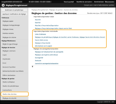 1 | Cliquez sur [Réglages du périphérique (réglages de transfert, carnet d'adresses, réglages favoris de la fonction d'envoi)] dans [Importation/Exportation individuelle]. |