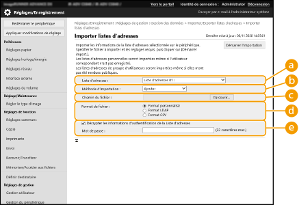 3 | Configurez les réglages nécessaires. ![]() [Listes d'adresses]Sélectionnez la liste d'adresses qui est la destination d'import. [Méthode d'importation]Sélectionnez [Ajouter] si vous voulez ajouter les destinations importées sans supprimer la liste d'adresses actuelle ou sélectionnez [Supprimer et remplacer] si vous voulez supprimer la liste d'adresses actuelle et écraser les données avec les destinations importées. [Chemin du fichier]Cliquez sur [Parcourir...], et sélectionnez le fichier à importer. [Format de fichier]Sélectionnez le format de fichier des données à importer. Sélectionnez [Format personnalisé] pour les fichiers dans le format dédié pour les imprimantes multifonctions Canon (*.abk), sélectionnez [Format LDAP] pour les fichiers de format LDAP (*.ldif), ou bien sélectionnez [Format CSV] pour les fichiers de format CSV (*.csv). [Décrypter les informations d'authentification de la Liste d'adresses]Lors de l'import de fichiers cryptés, cochez la case et saisissez le même mot de passe que celui qui a été saisi quand les données de réglage ont été exportées. |