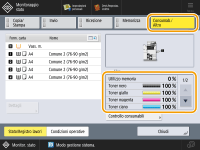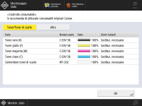 È inoltre possibile verificare la quantità rimanente di consumabili e parti premendo <Condizioni operative> nella parte inferiore della schermata <Monitoraggio stato>. |