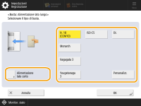 2 | Selezionare l'orientamento e il tipo di busta. ![]() Se è stato modificato il posizionamento delle buste, premere <Alimentazione lato corto> o <Alimentazione lato lungo> e selezionare il tipo di busta. Se è stato scelto il posizionamento verticale per le buste Nagagata 3, premere <Avanti> e specificare la lunghezza della linguetta. Per registrare una busta in formato personalizzato, premere <Personalizz.> <Avanti> quindi <X> o <Y> per specificare il lato, quindi utilizzare i tasti numerici per inserire la lunghezza del lato specificato.![]() Quando si usano le buste Kakugata 2, posizionarle orizzontalmente. |