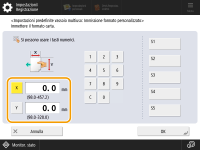Premere <X> o <Y> per inserire la lunghezza di ciascun lato usando i tasti numerici. ![]() Se si registra il formato carta usato frequentemente sui pulsanti da <S1> a <S5>, è possibile richiamarlo tramite la pressione di un solo tasto. Registrazione della carta di formato libero (carta di formato personalizzato) | |