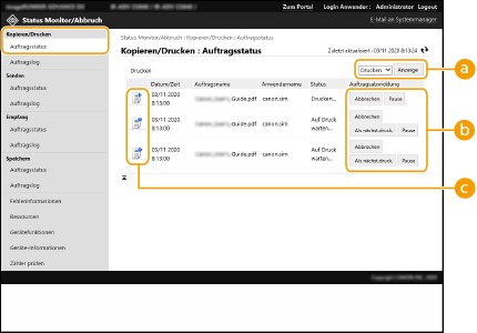 Sie können Remote UI zum Überprüfen des Status der Dokumente, die auf ihre Verarbeitung warten, sowie der Protokolle der Dokumente, die verarbeitet wurden, verwenden. Sie können auch den Status des Geräts wie beispielsweise Fehlerinformationen und verbleibende Menge der Verbrauchsmaterialien überprüfen.