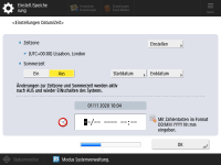 Legen Sie das Datum und die Uhrzeit des Geräts fest. ![]() ![]() Geben Sie Datum und Uhrzeit ein, und drücken Sie <OK>. Stellen Sie <Zeitzone> und <Sommerzeit> nach Bedarf ein. Weitere Informationen dazu finden Sie unter Einstellen von Datum/Uhrzeit. | |