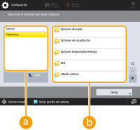 (Configuración) para ver la pantalla <Configuración>. Púlsela para introducir cambios en cada opción, como la configuración del papel, los ajustes de la pantalla y las opciones de red. En esta pantalla, también puede registrar destinos, como direcciones de correo electrónico y números de fax.
