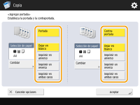 Para añadir una contraportada, pulse <Contraportada>. Al copiar en la contraportada, puede establecer dónde copiar, en el anverso, en el reverso o en ambos.