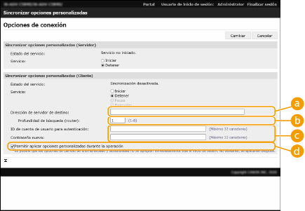 Pulse  (Configuración)  <Opciones de gestión>  <Gestión del dispositivo>  configure <Sincronizar opciones personalizadas (Cliente)> en <Activar>.