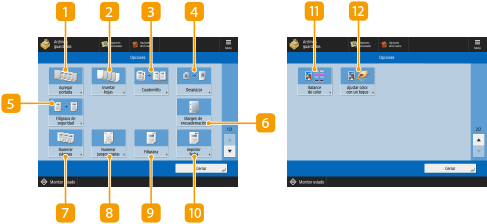 | <Muestra impres.> aparece solo si establece la realización de varias impresiones y uno de los siguientes ajustes al mismo tiempo. Tenga en cuenta que las funciones disponibles pueden variar en función del modelo y de las opciones instaladas. <Clasificar (por juegos)> <Desplazar> <Rotar 90 grados> <Grapar + Clasificar> <Cuadernillo> <Portada> <Insertar hojas> <Fusionar archivos e imprimir> cuando se seleccionan varios archivos |