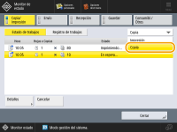 Seleccione <Copia> en la lista desplegable y verá los trabajos de copia en espera.