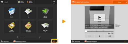 Lorsque le tambour approche la fin de sa durée de vie, un message vous invitant à le remplacer s'affiche en bas de l'écran. Appuyez sur l'icône en bas à droite de l'écran et suivez les instructions à l'écran pour procéder au remplacement.