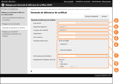 Une demande d'émission du certificat nécessaire pour les clés générées avec la machine peut être envoyée à un serveur SCEP (Simple Certificate Enrollment Protocol) gérant les certificats. Les certificats émis à partir du serveur SCEP sont automatiquement enregistrés dans la machine. Des privilèges Administrator sont nécessaires pour envoyer une demande d'émission d'un certificat.
