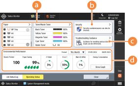 Você pode exibir uma tela para verificar o status de vários itens simultaneamente, como quantidade restante de papel e toner, status das medidas de segurança da impressora, informações de suporte para resolução de problemas que ocorrem durante o envio de faxes e impressão, e o status do trabalho de impressão e consumo de energia dentro de um período específico.