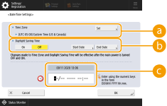 Se você alterou a configuração de <Time Zone> ou <Daylight Saving Time>, será necessário reiniciar a máquina apertando o botão DESLIGAR. Pressione o interruptor de alimentação para DESLIGAR a máquina ( DESLIGANDO a máquina). Quando passarem 10 ou mais segundos após o indicador de força ter desligado, LIGUE a máquina novamente ( LIGANDO a máquina). |