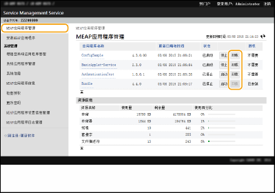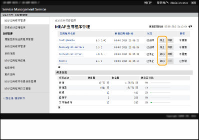 如果单击位于运行状态右侧的[开始]/[停止]按钮,可以开始/停止使用MEAP应用程序。