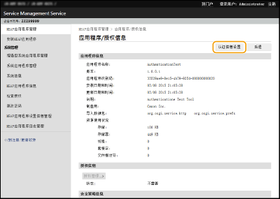 如果单击MEAP应用程序名称,会显示各个应用程序的公司名称和存储器使用量等详细信息。可以从此处执行授权管理。 管理MEAP应用程序授权