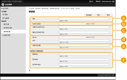 4 | 输入必要的信息。 ![]() [域名:]输入登录目标的Active Directory的域名(示例:company.domain.com)。 [NetBIOS名称]输入NetBIOS域名(示例:company)。 [主要主机名或IP地址:] / [辅助主机名或IP地址:]输入Active Directory服务器的主机名或IPv4地址。使用辅助服务器时,在[辅助主机名或IP地址:]中指定名称。 示例: 使用主机名:ad-server1 使用IPv4地址:192.168.18.138 [用户名:] / [密码:]输入用于访问和检索Active Directory服务器的用户名和密码。 [检索开始位置:]以指定执行Active Directory服务器认证时访问和搜索用户信息的位置(等级)。 [登录名称:] / [显示名称] / [电子邮件地址]为Active Directory服务器上每个用户帐户的登录名称、显示名称和电子邮件地址指定数据字段(属性名称)(示例:sAMAccountName、cn、mail)。 |