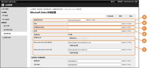 3 | 指定 Microsoft Entra ID 信息。 ![]() [登录目标名称]输入要在登录目标显示的名称。 * 无法控制字符或空格。 [域名]输入作为登录目标的 Microsoft Entra ID 的域名。 [应用程序ID]输入应用程序(客户端)ID。 [密钥]输入 Microsoft Entra ID 生成的密钥。使用 [密钥和证书] 时不需要输入此项。 [密钥和证书]使用密钥和证书时,请按 [密钥和证书]。 可以按 [导出证书] 导出要注册到 Microsoft Entra ID 的证书。 [Microsoft Entra ID认证URL] 和 [Microsoft Entra ID API URL]输入 URL。根据使用的云环境,可能需要更改设置。 |