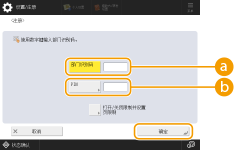3 | 输入“部门识别码”和PIN,然后按<确定>。 ![]() <部门识别码>在“部门识别码”中输入不超过七位数字。 <PIN>在PIN中输入不超过七位数字,然后按<确认>。再次输入PIN以确认,然后按<确定>。如果不想设置PIN,则不要填写此项。 ![]() 无法注册仅包含0的部门识别码或密码,如“00”或“0000000”。 即使输入少于七位,会将零添加到数字开头,设置七位数字。 可以按<打开/关闭限制并设置页限制>设置允许部门用于复印、扫描和打印的总页数。 同样可以要求注册部门识别码和密码时必须输入七位数。欲知更多信息,请与经销商和服务代表联系。 如果在打印包含彩色和黑白区域的文档时达到任何一种彩色或黑白页数限制,本机会停止打印。 如果在复印包含彩色和黑白区域的文档时达到任何一种总的彩色或黑白打印或复印限制,本机会停止复印。 |