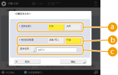3 | 设置团体。 ![]() <专用团体>/<团体名称1>/<团体名称2>要使用所选的团体,请按<打开>。如果不希望使用团体,请按<关闭>。 <MIB访问权限>对于各个团体,通过<读取/写入>或<只读>选择MIB访问权限。 <团体名称>使用字母数字字符输入所属的团体名称。如果选择<设置专用团体>,则无法设置专用团体名称。 |