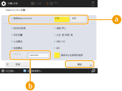 3 | 指定所需设置,按<确定>。 ![]() <使用Administrator>如果使用“管理员”,设置为<打开>。 <加密密码>如果使用的密码与认证不同,请取消选择<使用与认证相同的密码>,按<加密密码>,然后输入该密码。 ![]() 如果“管理员”被禁用,将无法设置<Administrator设置>(<使用Administrator>的设置将固定为<关闭>)。 |