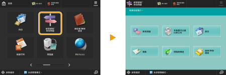按 <教學課程/常見問題> 可顯示介紹如何使用本機功能以及影印、掃描等使用提示的畫面。要瞭解可使用哪些功能以及如何使用這些功能時檢視此畫面。還可以從行動裝置存取常見問題頁面。