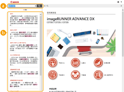 按一下 可顯示搜尋畫面,其中包含一個文字方塊,可執行關鍵字搜尋,並可尋找您要的頁面。