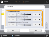 設定為<濃>端時,以最大濃淡度列印的區域會增加。設定為<少量>端時,列印的填滿區域、文字和線條看似缺少點的半色調。此設定主要用於調整中間濃淡度。