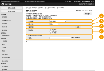 3 | 指定需要的設定。 ![]() 將會刪除目前的通訊錄,並且以匯入的通訊錄資訊覆寫。 匯入時,必須等到機器重新啟動後才能在遠端使用者介面上執行任何作業。此外,您在重新啟動機器後,匯入的設定才會生效。關閉/重新啟動本機電源 ![]() [檔案格式]選擇要匯入的設定資料的檔案格式。請注意,檔案格式會因為匯出資料的多功能印表機機型而異。查看要匯入的檔案。 [檔案路徑]按一下 [瀏覽...],然後指定要匯入的檔案。 [解密位址清單認證資訊]匯入加密檔案時,請選擇核取方塊,並且輸入密碼(此密碼需和匯出設定資料所輸入的密碼相同)。 |