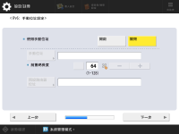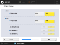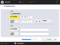 指定網路連線的設定。 ![]() ![]() 對於 <使用IPv4> 或 <使用IPv6> 按 <開啟>,並且按 <下一步>。您也可以使用 IPv4 和 IPv6。 如果對於 <使用IPv4> 和 <使用IPv6> 按 <關閉>,並且按 <確定>,請略過網路設定,並前進至步驟 10。 ![]() 如果對於 <使用IPv4> 按 <開啟>,請指定下列設定。 ![]() 若要自動取得 IP 位址,請按 <DHCP> 或 <自動IP>,然後按 <下一步> 或 <確定>。 若要手動取得 IP 位址,請清除對 <DHCP> 或 <自動IP> 的選擇,並按 <IP位址>、<子網路遮罩> 和 <閘道器位址> 輸入各個值,然後按 <下一步> 或 <確定>。 有關 IPV4 位址設定的資訊,請參閱設定 IPv4 位址。 ![]() 如果對於 <使用IPv6> 按 <開啟>,請指定下列設定。 ![]() 按 <開啟> 使用無狀態位址或按 <關閉> 不使用無狀態位址,然後按 <下一步>。 有關 IPv6 位址的資訊,請參閱設定 IPv6 位址。 ![]() 指定無狀態位址後,指定下列設定。 ![]() 按 <開啟> 使用手動位址或按 <關閉> 不使用手動位址,然後按 <下一步>。 若要使用手動位址,請按 <手動位址>、<前置碼長度> 和 <預設路由器位址> 輸入各個值。 ![]() 指定手動位址後,指定下列設定。 ![]() 按 <開啟> 使用 DHCPv6 或 <關閉> 不使用 DHCPv6,然後按 <確定>。 | |