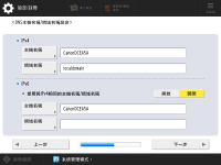 指定 DNS 伺服器位址、DNS 主機名稱和 DNS 網域名稱。 ![]() ![]() 按 <主DNS伺服器> 和 <次要DNS伺服器>,並輸入 DNS 伺服器的 IPV4/IPv6 位址,然後按 <下一步>。 有關 DNS 伺服器位址設定的資訊,請參閱進行 DNS 設定。 ![]() ![]() 按 <主機名稱> 輸入本機的名稱(主機名稱)。按 <網域名稱> 輸入本機所屬的網域名稱,然後按 <下一步>。 如果 IPv4 與 IPv6 的設定相同,請對於 <使用與IPv4相同的主機名稱/網域名稱> 按 <開啟>。 ![]() ![]() 若要使用 DNS 動態更新設定進行自動更新,請對於 <DNS動態更新> 按 <開啟>,然後按 <確定>。 如果對於 <IPv6> 將 <DNS動態更新> 設定為 <開啟>,選擇 <開啟> 將使項目自動註冊。 | |