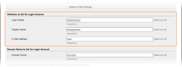 4 | Zadejte způsob nastavení názvů atributů a jména domény. ![]() [User Name (Keyboard Authentication):]Zde zadejte datové pole LDAP (název atributu) pro uživatelské jméno na serveru LDAP (Příklad: uid). [Login Name:] / [Display Name] / [E-Mail Address]Zde zadejte datová pole LDAP (názvy atributů) pro přihlašovací jméno, zobrazované jméno a e-mailovou adresu každého uživatelského účtu na serveru LDAP (Příklad: uid, cn, pošta). [Specify the domain name] / [Specify the attribute name for domain name acquisition]Vyberte, jak nastavit jméno domény místa určení pro přihlášení. Chcete-li zadat jméno domény přímo, vyberte [Specify the domain name] a zadejte jméno domény. Chcete-li zadat datové pole LDAP (název atributu), z něhož se má získat jméno domény na serveru LDAP, vyberte [Specify the attribute name for domain name acquisition] a zadejte název atributu (Příklad: dc). |