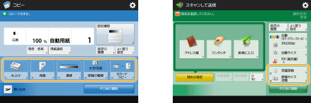 コピー、ファクス、スキャンの基本画面に表示されている設定ボタンを、他の設定ボタンに変更することができます。また、ログインしているユーザーによって異なる基本画面を表示させることもできます。