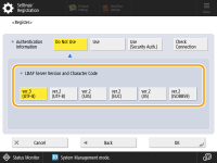 Authentication can be done more safely by encoding the data exchange. When this measure is employed, the LDAP version and character code information are set to <ver.3 (UTF-8)>. The time of the machine and LDAP server need to be synchronized.