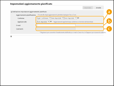 Selezionare la casella di controllo per [Abilitazione impostazioni aggiornamento pianificato] e configurare le impostazioni necessarie.