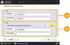 Per impostare il nome host e il nome di dominio affinché siano gli stessi di IPv4, premere <On> in <Utilizzo stesso nome host/nome dominio di IPv4>. Per impostarli in modo che siano diversi da quelli di IPv4, premere <Off>.