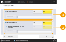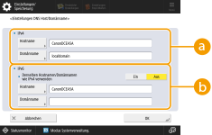 Um die gleichen Einstellungen für Hostname und Domänennamen wie bei IPv4 festzulegen, drücken Sie in <Denselben Hostnamen/Domännamen wie IPv4 verwenden> auf <Ein>. Um von IPv4 abweichende Einstellungen vorzunehmen, drücken Sie <Aus>.