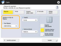 Al copiar documentos que incluyen información confidencial, puede integrar texto invisible, tal como "TOP SECRET" o "CONFIDENCIAL" para avisar a los usuarios no autorizados de que no deben copiarlos. Al copiar un documento que ya se ha copiado, el texto integrado aparece en toda la página para evitar copias no autorizadas de copias. Opciones del sistema
