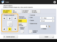 Los números y símbolos no se imprimen en las portadas (Añadir una portada y una contraportada) u hojas insertadas (Insertar hojas y páginas de capítulo (hojas insertadas)). Los números de conjuntos de copias se imprimen en todas las páginas copiadas. Los números de conjuntos de copias se pueden imprimir conjuntamente con las fechas o el texto. <Configuración opc. numerar juegos de copias> El texto para <Numerar páginas> y <Filigrana> también puede seleccionarse del texto que se ha registrado en <Guardar caract. para numerar págs./Filigrana>. Si configura dos de las opciones <Numerar páginas>, <Filigrana>, <Imprimir fecha> o <Numerar juegos de copias> para imprimir en la misma posición, cuando pulse (Inicio) aparecerá un mensaje preguntando si hay que imprimir con estas opciones .Si selecciona <Con números de capítulo> junto con <Insertar hojas>, los números de los capítulos se cuentan de la siguiente forma: Después de insertar cada página de capítulo Después de insertar una inserción de hojas Si establece <Configuración opc. numerar juegos de copias> en <Sí>, la configuración que puede especificar cambia de la siguiente manera. <Configuración opc. numerar juegos de copias> Ya no puede seleccionar <Toda la superficie> y <Números en 5 posiciones> para imprimir posiciones en el modo de numeración de juegos de copia. Los tamaños de los números del modo de numeración de juegos de copia pasan a ser <10,5 pt>, <12,0 pt> y <14,0 pt>. |