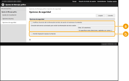 Haga clic en [Licencias/Otros]  [Ajustes de Mensaje gráfico] [Opciones de seguridad].