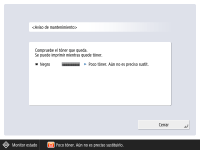 Si ya ha preparado un cartucho de tóner nuevo, etc., y la notificación se vuelve innecesaria, realice la operación <Eliminar mensaje de error de tóner restante>.