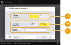 La comunidad dedicada es una comunidad predefinida para el software de gestión de dispositivos de Canon. Para utilizar la comunidad dedicada, pulse <Establezca comunidad dedicada>. Para especificar una comunidad general, pulse <Configurar nombre de comunidad 1> o <Configurar nombre de comunidad 2>. Para obtener más información, consulte el manual del software que esté usando.