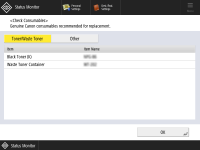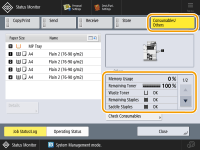 Você também pode verificar a quantidade restante de consumíveis e peças pressionando <Operating Status> na parte inferior da tela <Status Monitor>. |